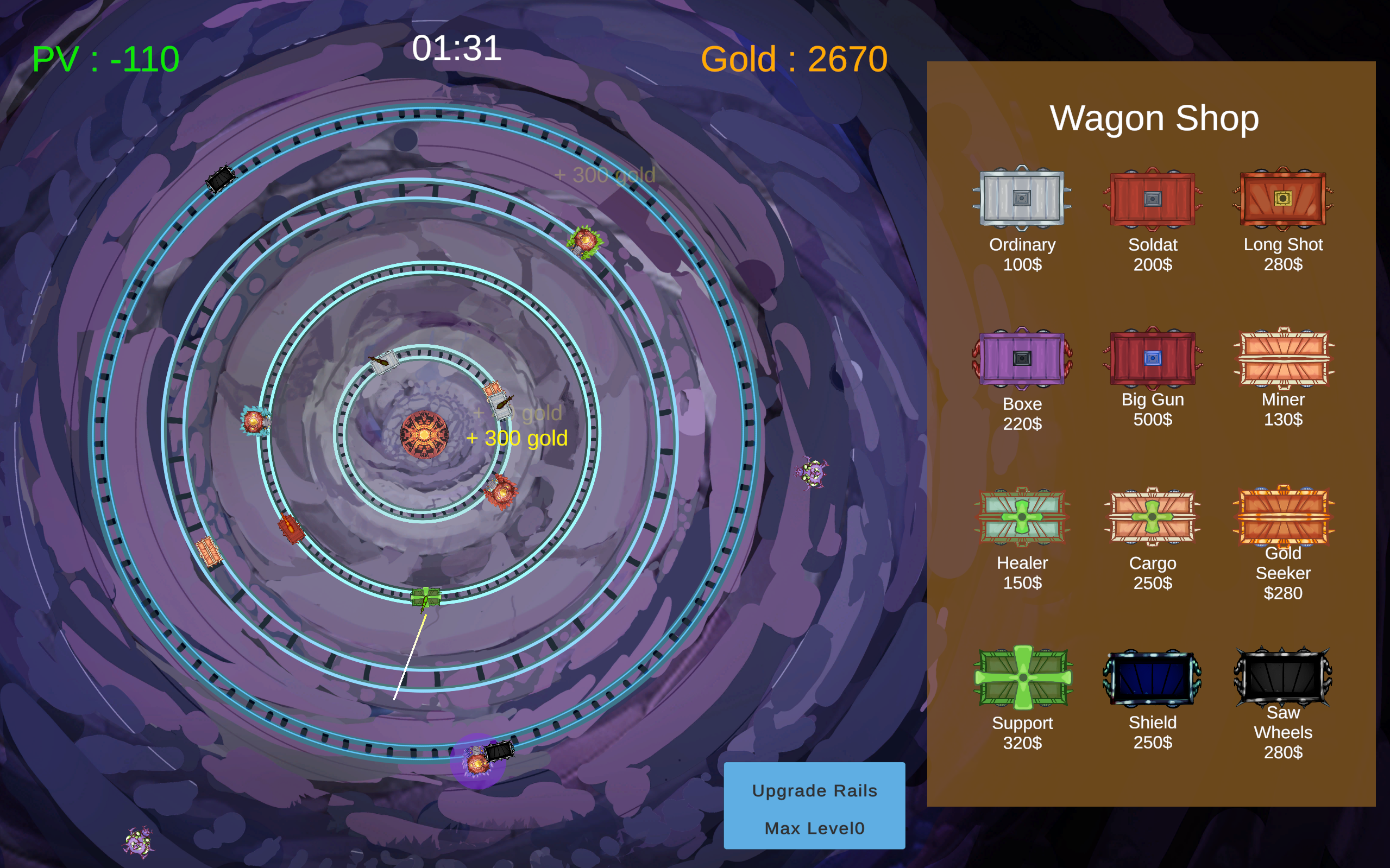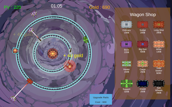 Each time a wagon completes a full loop, you earn gold. Buy more wagons to withstand monster attacks. Purchase new tracks with gold. Click on the minerals to be able to buy them wagons.